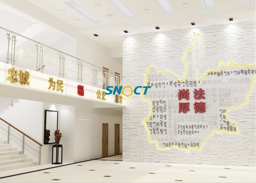 阿壩縣人民檢察院位于阿壩藏族羌族自治州阿壩縣阿壩鎮(zhèn)。以“守護一方凈土”為主線,通過規(guī)劃四個主題來詮釋主線:以檢凝民心、丹心為民意、正本亦清源、和光煦檢路,結(jié)合當?shù)鬲毺氐拿褡逶卣宫F(xiàn)檢察文化、職能文化、紀律文化和團隊文化,將阿壩縣檢察人以普法力、服務力、戰(zhàn)斗力、關懷力守護阿壩縣山水人城一方凈土的故事娓娓道來。本次設計的主題為:一樓“以檢凝民心”,二樓“丹心為民意”,三樓“正本亦清源”,四樓“和光煦檢路”。